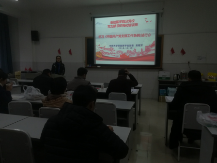 为落实《国产探花 关于深化巡视整改工作的推进方案》的有关要求,12月19日,基础医学院党委在后栋352教室开展2018党支部书记强化培训班,学习《中国共产党支部工作条例(试行)》,培训班由基础医学院党委书记黄菊芳授课,党委副书记刘谭明主持。