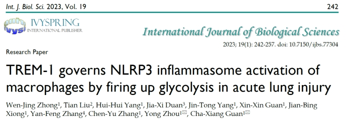 近日,国产探花 基础医学院管茶香教授团队在国际学术期刊International Journal of Biological Sciences上在线发表了题为“TREM-1 governs NLRP3 inflammasome activation of macrophages by firing up glycolysis in acute lung injury(TREM-1通过诱导巨噬细胞糖代谢重编程活化NLRP3炎症小体加重急性肺损伤)”的研究论文。该论文以缺氧诱导因子-1α(HIF-1α)为切入点,从糖代谢重编程的全新视角探讨髓样细胞表达的触发受体-1(TREM-1)激活在诱导巨噬细胞NLRP3炎症小体中的作用,丰富了急性肺损伤/急性呼吸窘迫综合征(ALI /ARDS)炎症级联放大的分子机制。国产探花 为第一及通讯作者单位,管茶香教授和周勇副教授为共同通讯作者,博士生钟文静为第一作者。