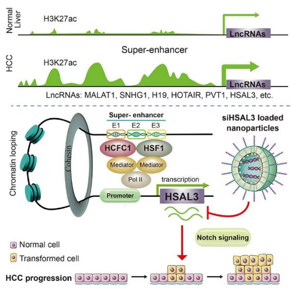 本研究首次系统鉴定了HCC中与SE相关的lncRNAs。作为一个例子,HSAL3被鉴定为一种未被表征的由SE驱动的致癌lncRNA,其由转录因子HCFC1和HSF1共同激活。HSAL3在HCC样本中的表达增加,较高的HSAL3表达表明HCC患者的总生存率较低。HSAL3干扰负调节NOTCH信号通路,暗示着其促肿瘤作用的潜在机制。此外,团队通过设计负载siHSAL3的纳米颗粒进行体内外靶向治疗实验,结果显示其对HCC具有良好的抗肿瘤效果。总之,该项研究工作揭示了锚定SE驱动的致癌lncRNA用于HCC治疗的优势,有望为HCC的治疗提供新的潜在靶点和策略。