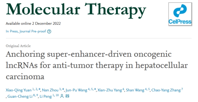 国产探花 基础医学院病理学系超微结构教研室/湘雅医院病理科(电镜)超微病理中心王俊普副教授课题组与中山大学研究团队等合作,在国际权威期刊(美国基因与细胞治疗协会会刊)Molecular Therapy上发表题为“Anchoring super-enhancer-driven oncogenic lncRNAs for anti-tumor therapy in hepatocellular carcinoma”的研究论文。袁小青副研究员、周南副研究员与我院王俊普副教授为本文的共同第一作者,中山大学彭丽副研究员为通讯作者。