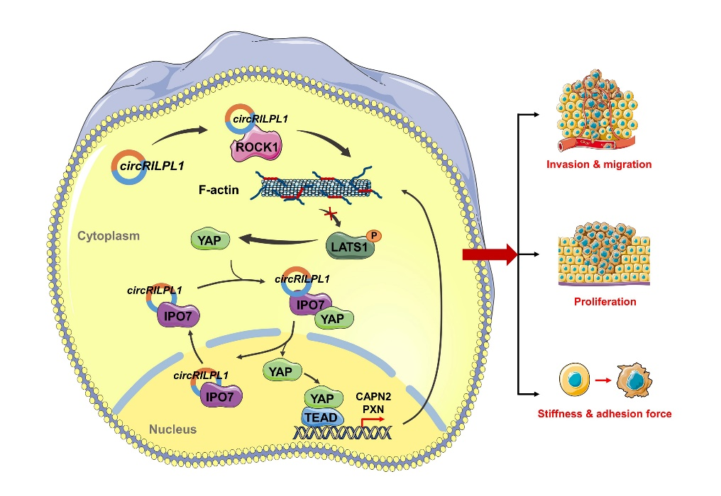 在本研究中,研究者通过分析鼻咽癌转录组数据,首次发现环状RNA分子circRILPL1在鼻咽癌中表达增高,并且与鼻咽癌患者预后不良相关。circRILPL1由RILPL1基因的第3、4号外显子反向拼接形成。采用细胞和动物模型研究表明circRILPL1高表达显著促进了鼻咽癌细胞在体外、体内的增殖和转移能力。circRILPL1降低了鼻咽癌细胞的粘附能力和细胞膜表面硬度,引起细胞骨架重构。进一步研究发现circRILPL1是通过结合并激活ROCK1,抑制了Hippo信号通路关键激酶LATS1的活性,降低了LATS1催化的YAP蛋白Ser127、Ser397位点的磷酸化水平,从而阻止YAP蛋白降解。另一方面,circRILPL1还可以与核输入受体IPO7蛋白结合,协同促进YAP蛋白转运至细胞核,激活YAP信号通路,增强细胞骨架重塑因子CAPN2和PXN的基因转录,导致其表达上调。
