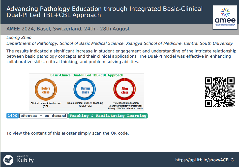 同期,在基础医学院教师教学发展中心及国际化交流小组的大力支持和资助下,赵璐晴老师作为欧洲医学教育协会会员(AMEE Full Member),在线参加了欧洲医学教育协会AMEE 2024 annual meeting(2024年8月24日-28日 瑞士巴塞尔)。欧洲医学教育协会是全球最大、极具影响力的医学教育学术组织,每年举办的AMEE年会是医学教育领域的盛事,吸引了来自世界各地的医学教育专家、学者和实践者参与,本届AMEE年会的主题是“Develop your educational career: connect, grow and inspire with AMEE 2024”。赵璐晴老师的病理学教学研究成果《Advancing Pathology Education through Integrated Basic-Clinical Dual-PI Led TBL+CBL Approach》入选2024 AMEE年会电子壁报展示,与世界各地的医学教育专家共同交流医学教育相关的研讨和分享经验。