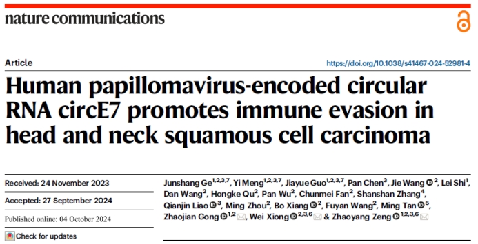近日,国产探花 基础医学院肿瘤研究所曾朝阳、熊炜联合湘雅二医院口腔医学中心龚朝建在Nature Communications杂志发表了题为“Human papillomavirus-encoded circular RNA circE7 promotes immune evasion in head and neck squamous cell carcinoma”(人乳头瘤病毒编码的环状RNA circE7促进头颈鳞癌免疫逃逸)的研究论文。该研究发现人乳头瘤病毒(Human papillomavirus, HPV)通过编码环状RNA circE7,下调免疫检查点分子Galectin-9的表达,促进头颈部鳞状细胞癌(head and neck squamous cell carcinoma, HNSCC)免疫逃逸的新机制,并基于该发现提出了TIM-3 (Galectin-9在T细胞上的受体)单抗与现有PD-1单抗联合使用提高头颈鳞癌免疫治疗效果的新思路。