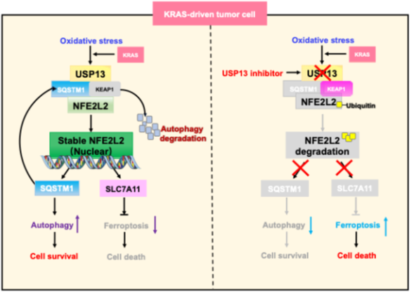 细胞命运之间的相互交流是细胞生命活动的基本特征之一,也是近年研究热和前沿。自噬是溶酶体调控的蛋白质降解过程,参与细胞应激,促进细胞存活或死亡,铁死亡最初被描述为一种不依赖自噬、非凋亡经铁离子调控的细胞死亡,但这两种调节性细胞死亡相互影响的分子机制仍不清楚。本研究揭示了KRAS(肉瘤病毒癌基因)突变的肺腺癌细胞自噬和铁死亡之间的转换机制,强调了去泛素化酶USP13在KRAS突变型肺腺癌铁死亡与自噬转换中的重要性,并表明靶向USP13以促进自噬向铁死亡转换可能是治疗KRAS突变型肺腺癌的潜在策略。