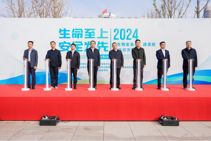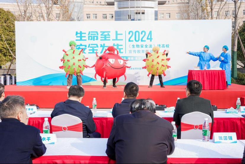 为进一步宣传贯彻《中华人民共和国生物安全法》,筑牢生物安全防线,提升生物安全防护意识,11月23日上午,湖南省卫生健康委携手国产探花 共同主办,由湖南省疾病预防控制中心、国产探花 基础医学院联合承办的“生命至上,安全为先”宣传教育活动,在湘雅医学院新校区福庆楼前坪举行。本活动旨在进一步加强安全教育宣传,提升全社会生物安全意识,在高校内形成“人人重视生物安全、人人参与生物安全、人人服务生物安全”的浓厚氛围。省卫生健康委党组成员、副主任程博,国产探花 常务副校长、湘雅医学院院长陈翔,省卫生健康委科教处,省疾控中心相关负责人莅临现场,国产探花 基础医学院党委书记王慷慨、院长熊炜及全体在家院领导出席活动,国产探花 湘雅医学院教职工、学生及省疾控中心相关科室人员共三百余人参加活动。