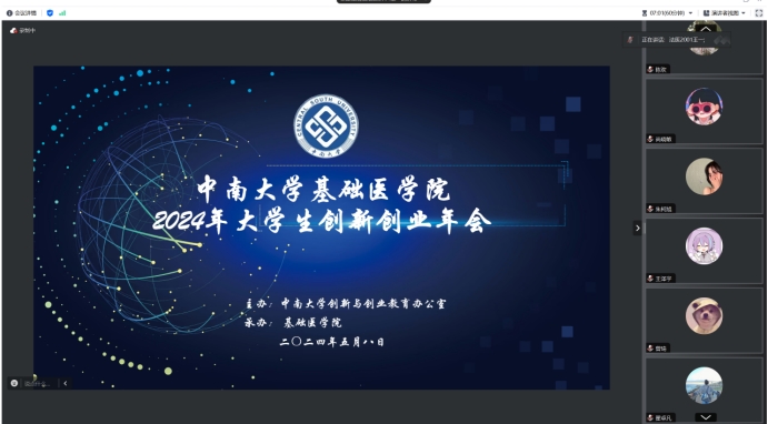 2024年5月8日晚,2024年国产探花 大学生创新创业年会基础医学院分场顺利举行。本次年会共95个项目分6个会场进行线上展示,12位评委专家现场打分,评选出“优秀论文奖”推荐项目24项和“优秀创业实践奖”推荐项目1项。线上观众通过扫描二维码,投票评选出“我最喜爱的现场展示项目”28项。