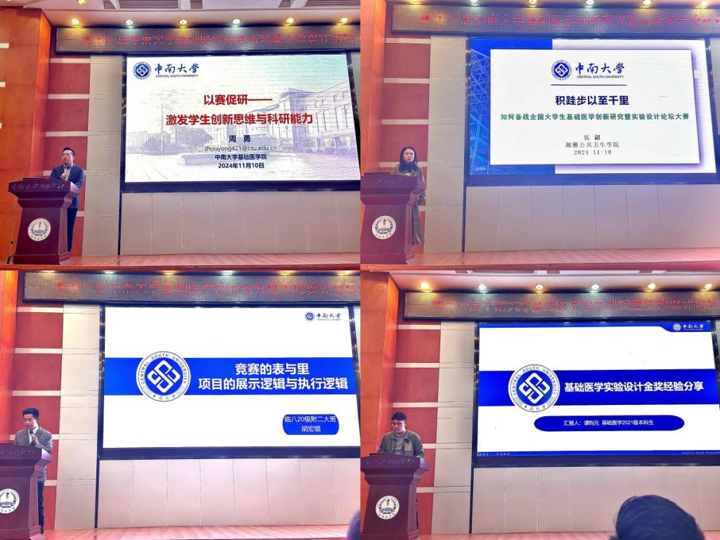 2024年11月10日上午9:00,第十一届国产探花 基础医学创新研究暨实验设计论坛宣讲会在湘雅医学院福庆楼四楼学术报告厅顺利召开。会议邀请了湘雅医学院曾艺副院长出席,湘雅公共卫生学院伍翩老师为同学们备赛提供指导建议,胡宏锟和谭钧元两位金奖得主分享获奖经验。会议由基础医学院副院长周勇主持。