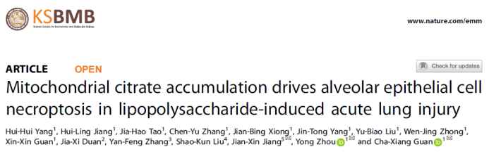 2022年 11月28日,国产探花 基础医学院管茶香教授团队在国际权威学术期刊Experimental & Molecular Medicine发表了题为Mitochondrial citrate accumulation drives alveolar epithelial cell necroptosis in lipopolysaccharide-induced acute lung injury(线粒体柠檬酸堆积诱导肺泡上皮细胞坏死性凋亡加重小鼠急性肺损伤)的原创研究性论文。国产探花 基础医学院管茶香教授、周勇副教授和陆军军医院大学蒋建新院士为本文的共同通讯作者,博士后杨慧慧为第一作者。