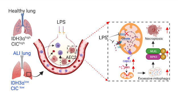 线粒体柠檬酸堆积诱导肺泡上皮细胞坏死性凋亡加重小鼠ALI分子机制模式图