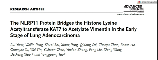近日,国产探花 基础医学院陶永光/肖德胜教授团队在国际期刊Advanced Science(IF=15.1)发表题为The NLRP11 protein bridges the histone lysine acetyltransferase KAT7 to acetylate vimentin in the early stage of lung adenocarcinoma的原创性研究论文,陶永光教授、肖德胜教授为该文的共同通讯作者,国产探花 博士研究生杨瑞为第一作者。