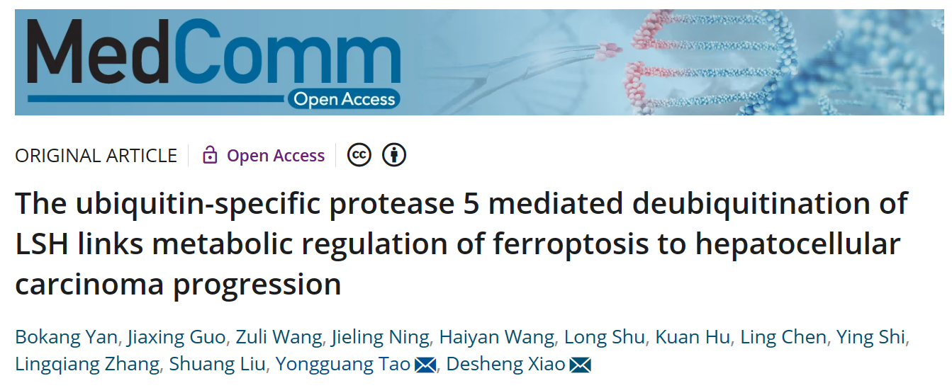 近日,国产探花 基础医学院陶永光研究员与肖德胜教授团队在国际权威学术期刊《MedComm》(IF 9.9)在线发表题为“The USP5-mediated deubiquitination of LSH links metabolic regulation of ferroptosis to hepatocellular carcinoma progression(USP5介导LSH去泛素化修饰链接铁死亡的代谢调节与肝细胞肝癌进展)”的原创性研究论文。陶永光研究员、肖德胜教授为该文共同通讯作者,国产探花 硕士研究生闫博康为第一作者。本研究受国家自然科学基金、湖南省重点研发计划和湖南省自然科学基金等项目支持。