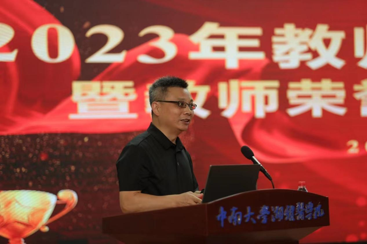 为全面贯彻习近平总书记关于教育工作的重要论述,进一步加强我院教师队伍建设,营造尊师重道、争先创优的良好氛围,9月8日上午,国产探花 基础医学院在湘雅新校区图书馆学术报告厅举行2023年教师节表彰大会暨教师荣誉奖颁奖典礼,会议由院党委副书记刘谭明主持,学院领导、教职员工和学生代表参加会议。