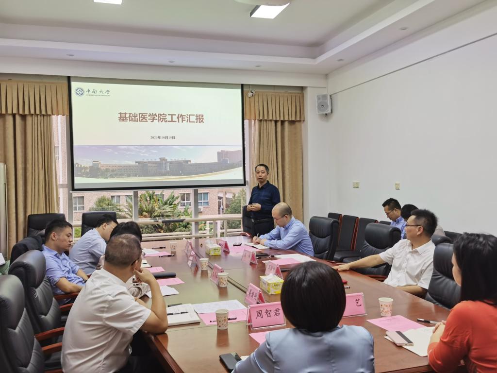 10月19日上午,湘雅医学院武明花常务副院长、吴世明副书记、刘洪副院长、黄耿文副院长、曾艺副院长和实验动物学部周智君主任、芙蓉实验室向波常务副主任一行来到基础医学院进行调研座谈,就学院学科发展建设进行深入交流,并给予针对性建议和指导。座谈会由学院党委王慷慨书记主持,全体院领导参加。
