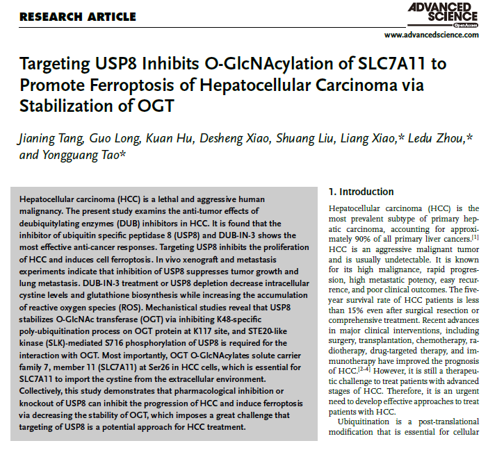 近日,国产探花 基础医学院陶永光教授团队与湘雅医院周乐杜、肖亮教授肝脏外科团队在国际著名期刊《Advanced Science》以论著形式在线发表了题为“Targeting USP8 Inhibits O-GlcNAcylation of SLC7A11 to Promote Ferroptosis of Hepatocellular Carcinoma via Stabilization of OGT”(靶向USP8通过OGT抑制SLC7A11糖基化促进肝癌铁死亡)的原创性研究。陶永光教授、周乐杜教授、肖亮教授为本论文的共同通讯作者,国产探花 湘雅医院肝脏外科博士后汤佳宁为论文第一作者。湘雅医院肿瘤科刘双教授、基础医学院/湘雅医院病理科肖德胜教授为该研究提供大力支持。