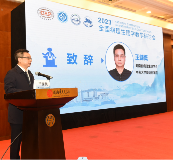 王慷慨教授代表湖南省病理生理学会致辞,并指出,本次全国病理生理学教学研讨会的召开,为全国各地的病理生理学教育工作者提供了一个宝贵的学习和交流机会,希望通过此次研讨会,促进相互交流和学习,共同推动全国病理生理学教学的进步和发展。