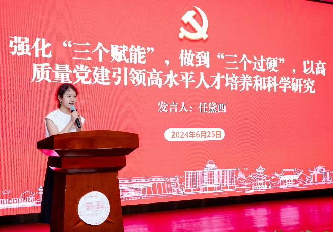 基础医学院综合办主任、研究生第三党支部书记毕晓艳围绕发挥“头雁”作用,打造“样板”支部主题进行发言,基础医学院研究生第三党支部副书记、博士生党员任黛西围绕强化“三个赋能”,做到“三个过硬”,以高质量党建引领高水平人才培养和科学研究主题进行发言。