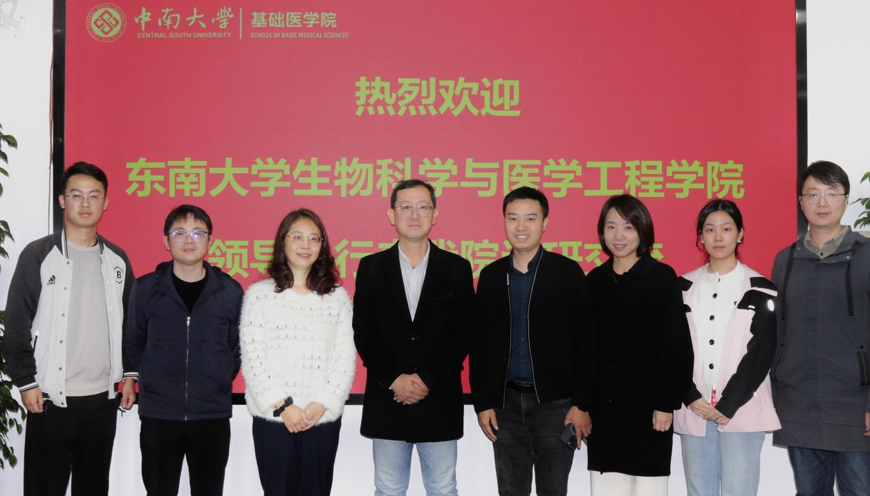 11月22日,东南大学生物科学与医学工程学院党委副书记周平一行到访我院,双方在湘雅新校区孝骞楼711会议室开展座谈。会议由院学工办主任胡名益主持,院党委副书记冯虹、院团委书记周正、生物医学工程系副主任陈昊彬、田博参加会议。
