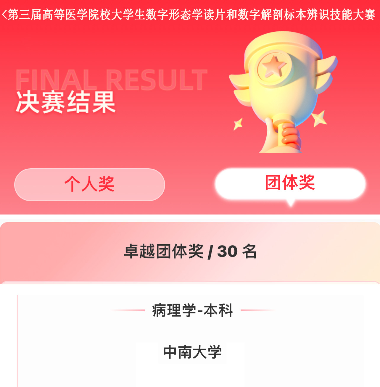 2024年12月1日,备受瞩目的“第三届高等医学院校大学生数字形态学读片和数字解剖标本辨识技能大赛”完美收官!经过激烈角逐,最终我院病理学系胡永斌、李翔、周庆三位老师指导选手在病理学专业组荣获11个奖项,其中一等奖3项、二等奖4项、三等奖4项,并荣获卓越团体奖,为湘雅110周年华诞献上一份厚礼。