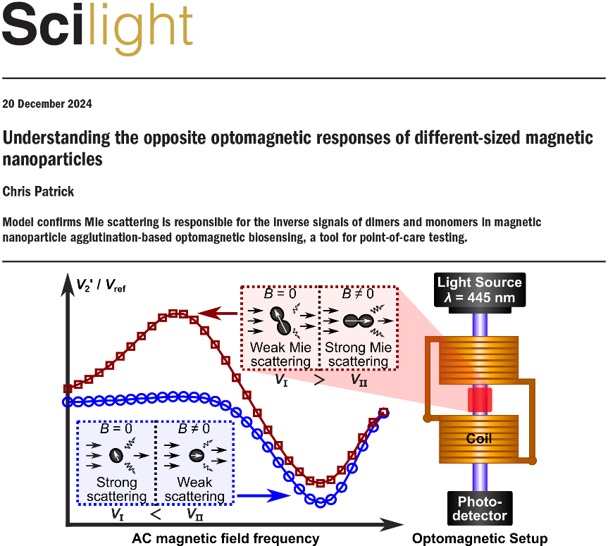 该研究成果作为编辑推荐文章同时被美国物理学联合会期刊《科学之光》(Scilight)以“认知不同尺寸磁纳米颗粒的反向光磁响应(Understanding the opposite optomagnetic responses of different-sized magnetic nanoparticles)”为题进行了采访报道。报道指出,“更好的认知光磁生物传感中的米氏散射现象有助于研究人员对光磁频谱的分析并推动这项技术的发展。”田博教授表示,该模型可用于开发新型光磁传感器,进一步提高对纳米颗粒表面生物识别反应的检测灵敏度和精确性。