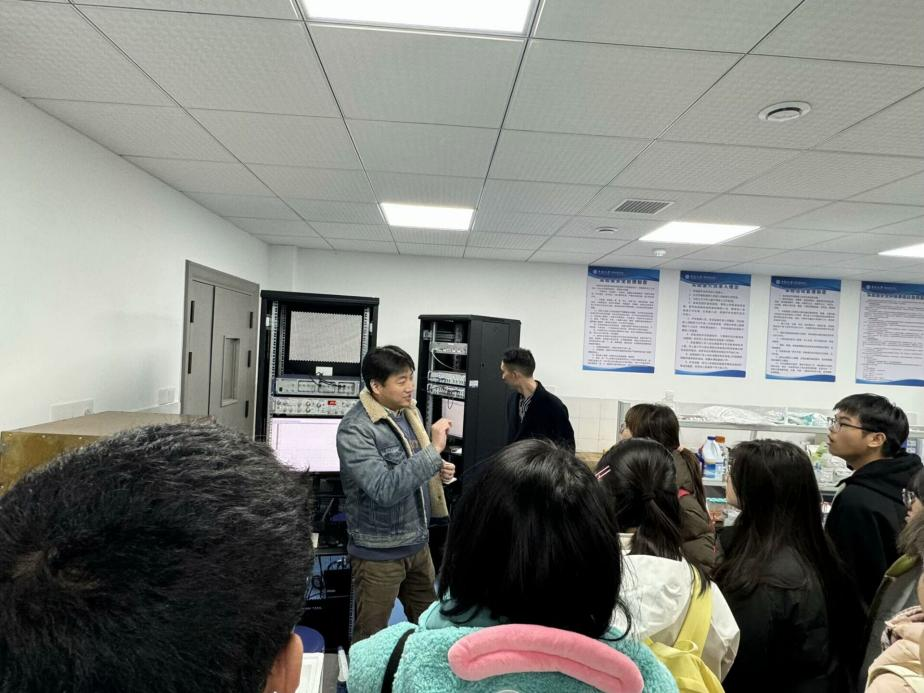 接着,在董竹新和尚艳杰老师的带领下,学生们前往基础医学拔尖基地进行参观学习。基地负责人首先介绍了实验室的整体情况,包括实验室的功能布局、实验设备以及近年来取得的科研成果。教授们深入浅出,将实验室的设施和基本运作原理介绍给学生们。学生们积极投入,对各种先进的实验设备和原理都产生了极大的兴趣,如高精度光谱仪、激光干涉仪、GPU算力服务器等,并现场观摩了力学和光学实验。前沿的科技开拓了学生们的视野,使学生们更广泛地了解生物科学领域的前沿,坚定了创新创业、创造新价值的决心。