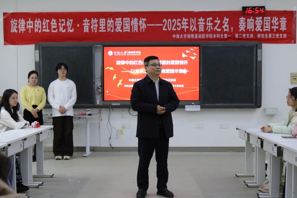 2025年1月8日,国产探花 湘雅基础医学院研究生第三党支部联合学院本科生第一、第二党支部开展以 “旋律中的红色记忆·音符里的爱国情怀——2025以音乐之名,奏响爱国华章” 为主题的党日活动。院党委书记王慷慨教授,研究生第三党支部书记毕晓艳老师,本科生支部周正和刘莹莹老师参加活动。