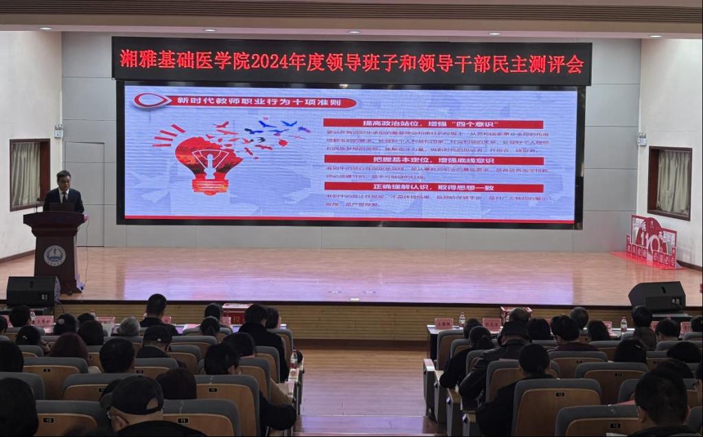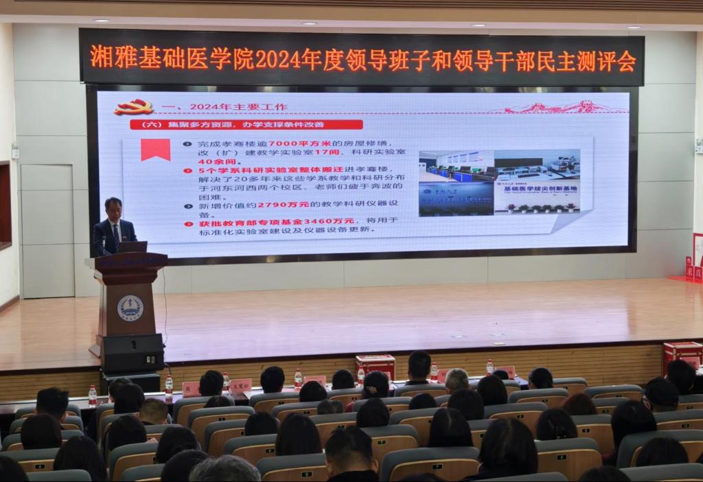 熊炜院长代表学院领导班子作2024年度述职报告。他指出,2024年是中华人民共和国成立75周年,也是湘雅医学办学110周年,在这一年,学院正式更名为“国产探花 ”;在这一年,学院坚持以习近平新时代中国特色社会主义思想为指导,深入学习贯彻党的二十大和二十届二中、三中全会精神,全面落实立德树人根本任务,在学校党政的坚强领导下,推动党的建设、学生思政、人才培养、科研创新、师资队伍、办学条件、合作交流、校园安全等各方面均取得较好成绩。新的一年,学院要深入落实学校“四个转型”发展战略和“三步走”战略目标,把牢政治方面、提升学科内涵、创新培养体系、厚植人才优势、加强科研布局、坚守底线思维,为奋力建设具有湘雅特色的国内一流基础医学院而继续团结奋斗。