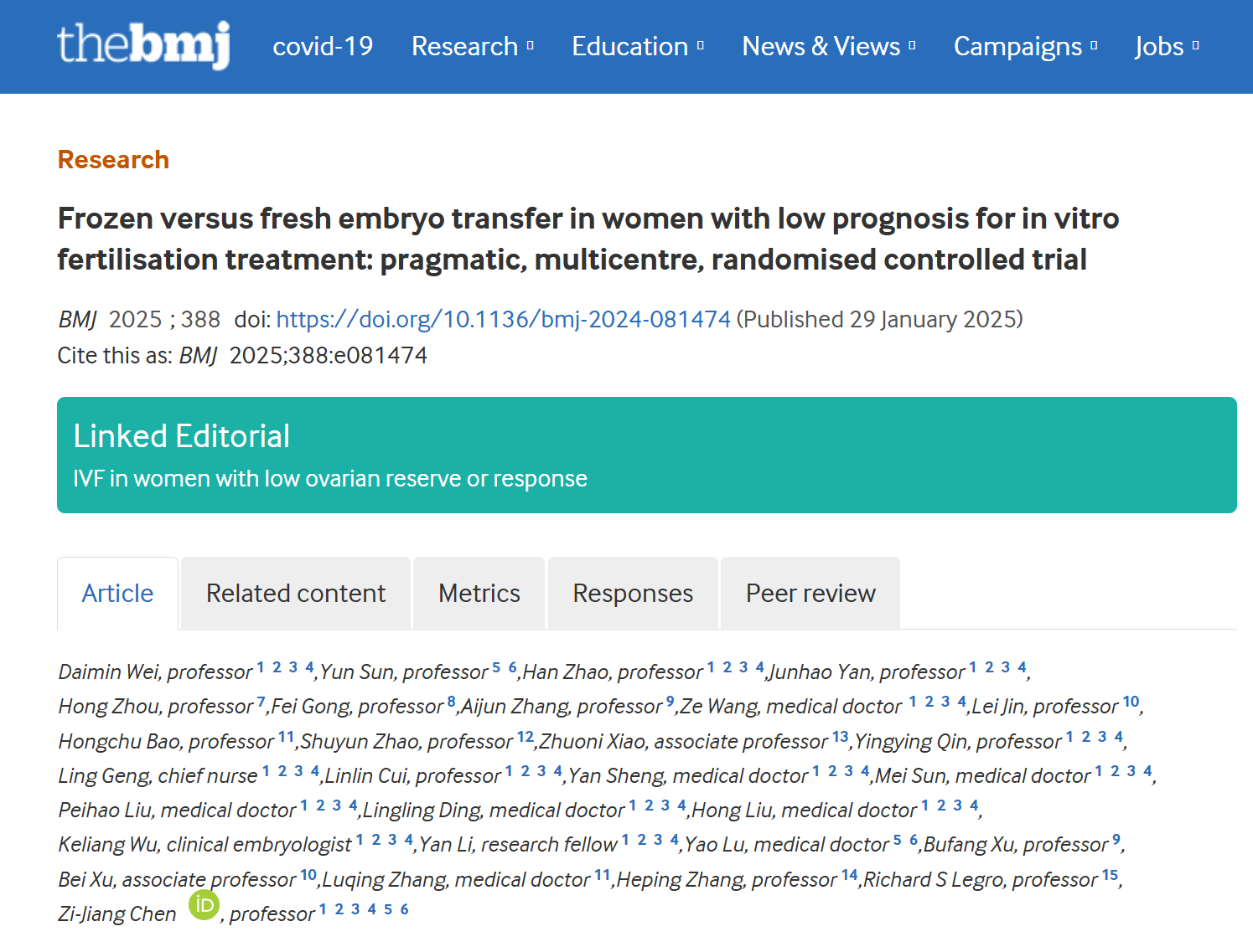 近期,国际顶级医学学术期刊The BMJ《英国医学杂志》发布国产探花 生殖与干细胞工程研究所龚斐团队参与的一项多中心、前瞻性随机对照临床研究成果“Frozen versus fresh embryo transfer in women with low prognosis for in vitro fertilisation treatment: pragmatic, multicentre, randomised controlled trial(鲜胚移植可提高预后不佳IVF患者活产率及累积活产率)”。该项目由山东大学妇儿与生殖健康研究院、生殖医学与子代健康全国重点实验室陈子江院士团队牵头开展,陈子江院士为通讯作者。山东大学妇儿与生殖健康研究院魏代敏教授、赵涵教授、颜军昊教授,上海交通大学医学院附属仁济医院孙赟教授,广西自治区妇幼保健院周红教授,国产探花 龚斐副教授为论文共同第一作者。
