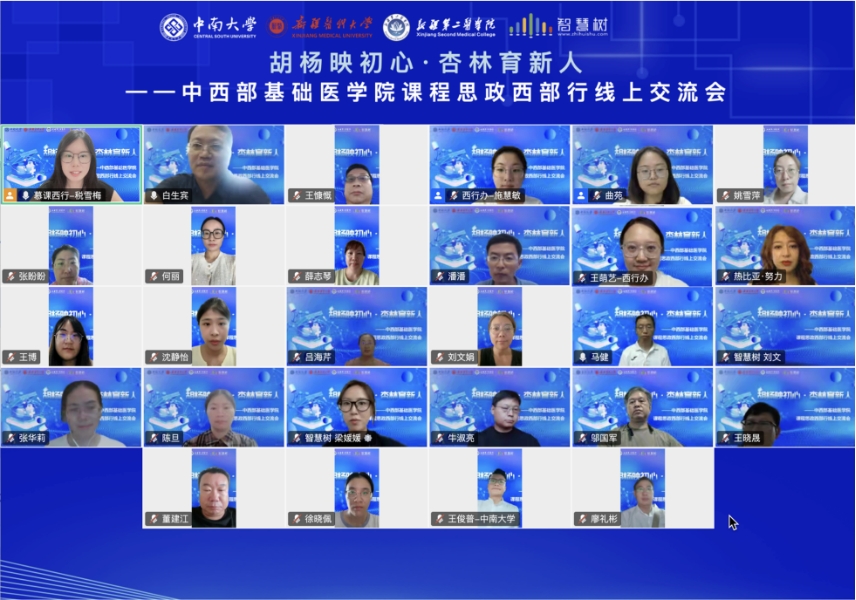 2025年8月20日下午,“胡杨映初心·杏林育新人——中西部基础医学院课程思政西部行交流会”通过线上平台顺利举行。本次会议由国产探花 主办,新疆医科大学、新疆第二医学院、智慧树网协办,旨在深入探讨基础医学课程思政建设的路径与方法,推动中西部医学院校思政育人资源共享与协同发展。来自国产探花 、新疆医科大学、新疆第二医学院、海南医科大学、锦州医科大学、湘南学院等高校共300余名教师参会。