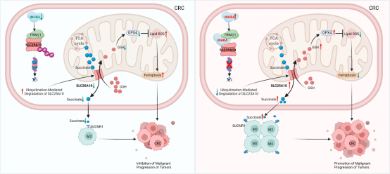 结直肠癌是全球高发恶性肿瘤,发病机制尚未完全阐明,且患者长期预后仍不理想,尤其是晚期或转移性病例。深入探究其分子机制、发现新治疗靶点和预后标志物,对改善患者临床结局至关重要。抑制素 βA属于转化生长因子 -β 超家族,近年因在多种肿瘤中上调并参与肿瘤进展而成为研究焦点。但它在结直肠癌中,尤其是肿瘤免疫和细胞死亡模式方面的精确机制仍不清楚。周艳宏课题组研究发现,抑制素 βA作为支架蛋白稳定线粒体蛋白 SLC25A10,一方面通过琥珀酸-琥珀酸受体轴诱导肿瘤相关巨噬细胞M2极化,重塑免疫微环境;另一方面激活 mtGSH/GPX4 轴抑制线粒体依赖性铁死亡,最终促进结直肠癌恶性进展。这一发现不仅揭示了 INHBA 在结直肠癌进展中的多重机制,还为开发新治疗策略提供了候选靶点。