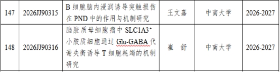近日,2026年度湖南省自然科学基金青年学生基础研究项目立项名单正式公布,我院周勇教授指导的王文嘉同学所申报项目《B细胞脑内浸润诱导突触损伤在PND中的作用与机制研究》,以及武明花教授指导的崔舒同学所申报项目《脑胶质母细胞瘤中SLCIA3+小胶质细胞通过Glu-GABA代谢失衡诱导T细胞耗竭的机制研究》成功立项。学院在本科生科研能力培养方面成效显著。