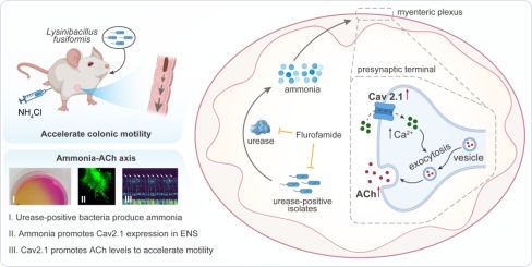 在这项研究中,余正团队提出了一种新的宿主-菌群互作框架,当肠动力受损、胆碱能信号减弱时,肠道菌群并非被动变化,而是可通过增强脲酶活性和氨生成,对宿主神经递质不足作出代偿性响应,从而帮助维持肠道运动功能。这一发现提示,肠道微生物来源的氨并非单纯有害副产物,而是可增强肠神经兴奋性、恢复胆碱能神经传递并维持肠道蠕动的功能性信号。