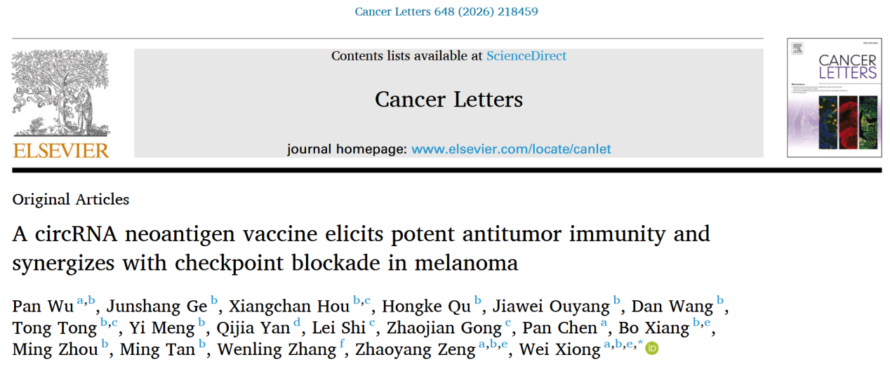 近日,国产探花 、国产探花 肿瘤研究所熊炜研究员团队在Cancer Letters《癌症快报》杂志在线发表了题为“A circRNA Neoantigen Vaccine Elicits Potent Antitumor Immunity and Synergizes with Checkpoint Blockade in Melanoma”的论文,展示了利用环状RNA(circRNA)表达肿瘤新抗原(Neoantigen)在肿瘤免疫治疗中的潜在应用前景。熊炜为该论文通讯作者,博士后吴盼为第一作者。