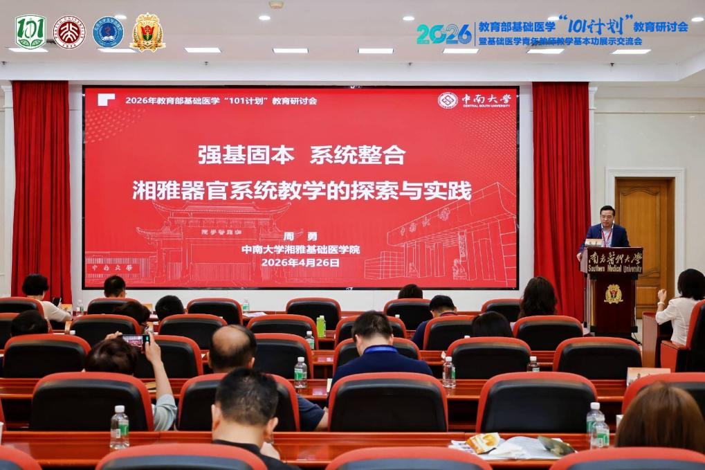 为扎实推进教育部基础医学“101计划”建设,深化基础医学教育教学改革、提升人才培养质量,2026年4月25-4月27日,教育部基础医学“101计划”教学研讨会暨基础医学青年教师教学基本功展示交流会在南方医科大学顺利召开。本次大会汇聚全国高校基础医学领域专家与骨干教师,聚焦教学创新、师资培育、学科育人等重点内容开展研讨交流。我院副院长周勇教授、生理学教学名师罗自强教授、生理学系主任向阳教授,学院教学管理张新平主任,生理学系周艳副教授,病理学系赵璐晴副教授以及学生代表杜思璇同学作为师生代表参与了此次盛会。