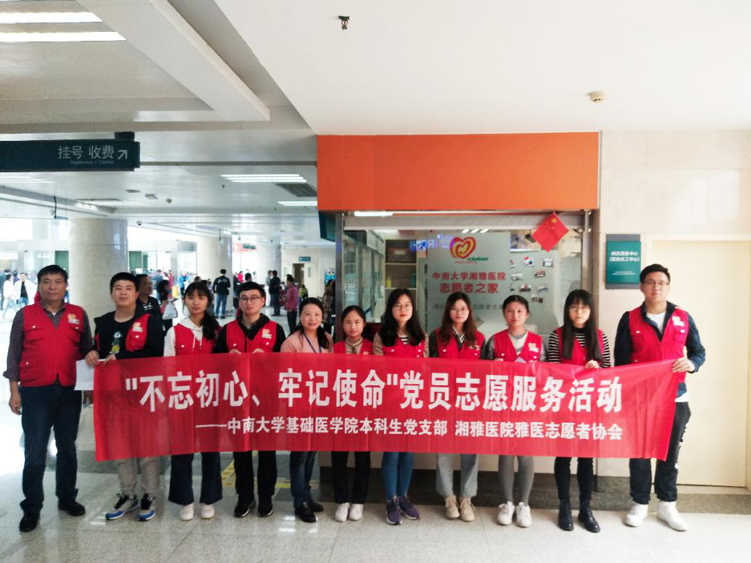 2019年10月24日、25日,基础医学院本科生党支部联合湘雅医院雅医志愿者协会,在国产探花 湘雅医院开展了“不忘初心、牢记使命”党员志愿服务活动,支部共有18名党员分两批次参加了此次活动。