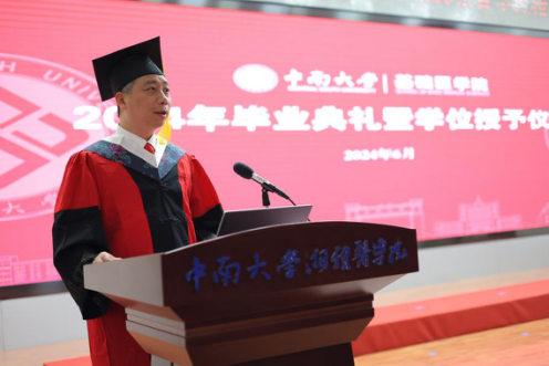 熊炜院长代表学院向圆满完成学业的2024年全体毕业生表示衷心祝贺,向悉心指导同学们成长成才的各位老师致以诚挚感谢他讲到,作为湘雅学子,我们的命运一直与国家和民族紧密相连,张孝骞、汤飞凡、李振翩等前辈们在学贯中西后乳燕还巢、兴医强国,用青春和热血书写了属于湘雅人的家国春秋。他嘱咐毕业生们,要传承湘雅精神,永葆家国情怀,与时代同呼吸、和祖国共成长,“有一分热,发一分光”,用生命来点燃烈焰,成为照亮祖国山海的点点萤火。