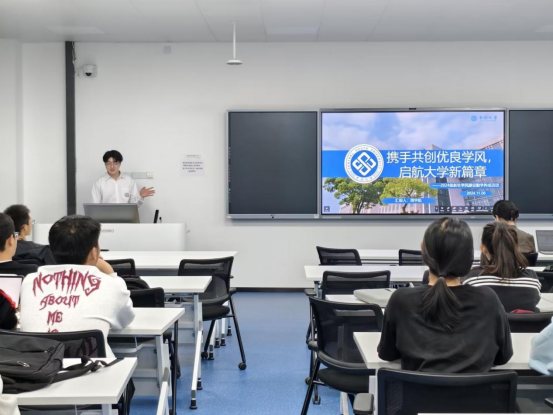 周宇航同学,连续两年专业排名第一,同时担任学生会学督部部长。他围绕“携手共创优良学风,启航大学新篇章”这一主题,深入阐述了学风建设的重要意义。