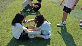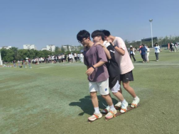 袋鼠跳:两人接力中,队员雷佳乐与蓝禄宝稳健跳跃,平衡技巧与速度并存,夺得团体第一,赢得队员阵阵喝彩。