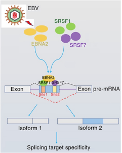 Recently, Ma’s group identified that EBV EBNA2 interacts with components of the splicing machinery.They discovered more than 2000 EBNA2-affected alternative splicing events by integrating SMRT sequencing (the third-generation sequencing technique) and RNA-sequencing, with a preference for exon skipping in genes involved with carcinogenic process such asHRAS. In addition, They evaluated the biological impact of EBAN2-affected alternative splicing events, and one novel candidatesMPPE1were selected whose alternative splicing correlated with EBNA2 expression. Particularly, EBNA2 regulatesMPPE1aberrant splicing by recruiting SRSF1 and SRSF7. Moreover, the abilities of EBNA2 in regulating gene splicing require EBNA2 phase separation. These foundings highlight a foundation for understanding the mechanism that EBNA2-mediated alternative splicing events as a potential key player in EBV-host interactions, which previously has not been appreciated.