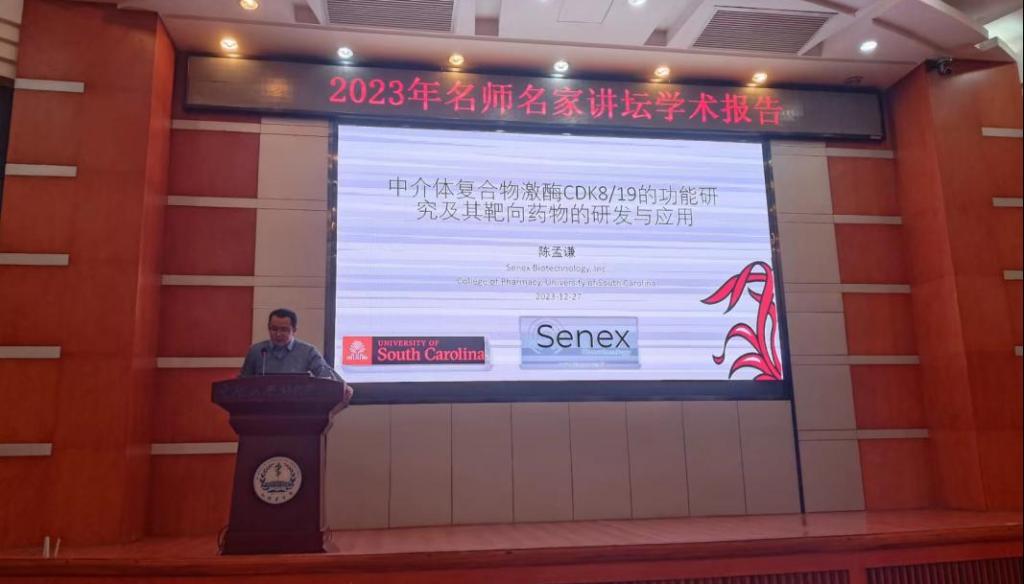 12月27日下午,我院生殖与干细胞工程研究所邀请了美国南卡罗来纳大学药学院助理教授、Senex生物技术公司研发总监陈孟谦教授来院做题为“中介体复合物激酶 CDK8/19 的功能研究及其靶向药物的研发与应用”的学术报告。学院党委王慷慨书记、黄河副院长、生干所范立青研究员出席,院内外100余名师生代表参加活动。会议由中生干所副所长孙懿主持。